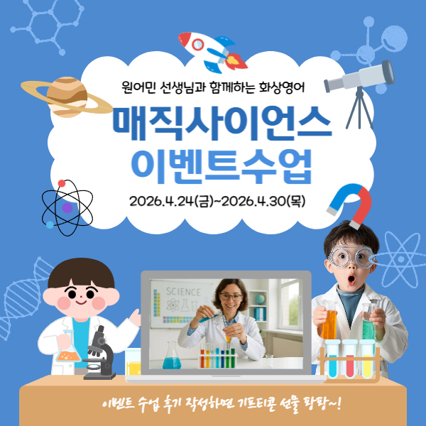 ![]() 📢 [5¿ù ¾î¸°À̳¯ Ưº° À̺¥Æ® – ¸ÅÁ÷ »çÀ̾𽺠¼ö¾÷ ¾È³»] ¾È³çÇϼ¼¿ä 😊 ´Ù°¡¿À´Â ¾î¸°À̳¯À» ¸Â¾Æ Ưº°ÇÑ ¸ÅÁ÷ »çÀ̾𽺠À̺¥Æ® ¼ö¾÷ÀÌ ÁøÇàµË´Ï´Ù! ¿ø¾î¹Î ¼±»ý´Ô°ú ÇÔ²²ÇÏ´Â È»ó¿µ¾î ¼ö¾÷¿¡¼ ´«À¸·Î º¸°í, ±Í·Î µè°í, ¿µ¾î·Î Âü¿©ÇÏ´Â ½Å±âÇϰí Àç¹ÌÀÖ´Â °úÇÐ ½ÇÇè ¼ö¾÷ÀÌ ÁøÇàµË´Ï´Ù! À̺¥Æ® ¼ö¾÷ ±â°£ 2026.04.24(±Ý) ~ 2026.04.30(¸ñ) ¡°ºñ´© ÇÑ ¹æ¿ï·Î ÈÄÃß°¡ µµ¸Á°£´Ù! ¹°ÀÇ Ç¥¸éÀå·Â ¸¶¼ú °úÇÐ ½ÇÇè!¡± * À̺¥Æ® ¼ö¾÷Àº Çлý Á¤±Ô ¼ö¾÷ ½Ã°£¿¡ ÁøÇàµË´Ï´Ù. * º» À̺¥Æ® ¼ö¾÷Àº ÇöÀç È»ó ¿µ¾î ¼ö¾÷À» ¼ö° ÁßÀÎ ÇлýºÐµé¿¡ ÇÑÇØ Âü¿© °¡´ÉÇÕ´Ï´Ù. (¼ºÀÎ ÇнÀÀںеé Áß Âü¿©¸¦ ¿øÇÏ½Ç °æ¿ì, īī¿Àä³Î·Î ¹®ÀDZÛÀ» ³²°ÜÁÖ½Ã¸é ¾È³» µµ¿Íµå¸®°Ú½À´Ï´Ù.) * Áغñ¹°: ÈÄÃß, ¹°, ºñ´© (¡°¼±Åà »çÇס±) -¸ÅÁ÷»çÀ̾𽺠À̺¥Æ®¸¦ 200% Áñ±â°í ½Í´Ù¸é Áغñ¹°°ú ÇÔ²²Çغ¸¼¼¿ä! -Áغñ¹°Àº ¼±ÅûçÇ×ÀÔ´Ï´Ù. Áغñ¹° ¹ÌÁöÂü ½Ã, ¼±»ý´ÔÀÇ ½Ã¿¬À» °üÂûÇÏ½Ã¸é µË´Ï´Ù. :) 🎁 À̺¥Æ® ¾È³» ¼ö¾÷ ÈÄ ¼ö¾÷ »çÁø + Èı⸦ ³²°ÜÁֽøé >> ¼ÒÁ¤ÀÇ ±âÇÁƼÄÜ ¼±¹° ÁõÁ¤! 🎁 Ưº°Çϰí Áñ°Å¿î ¿µ¾î °æÇèÀ» ¼±¹°ÇØ ÁÖ¼¼¿ä ¸¹Àº Âü¿© ºÎʵ右´Ï´Ù! *À̺¥Æ® ¼ö¾÷Àº Çлý ¼ö¾÷ ½Ã°£¿¡ ÁøÇàµË´Ï´Ù. *È»ó¿µ¾î ¼ö¾÷ Çлýµé¸¸ Âü¿© °¡´ÉÇÕ´Ï´Ù. |